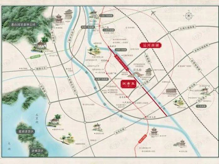 交通方面地铁1号线清名桥站距离1.5km,已经在建设中的5号线清明古桥站与项目仅有一河之隔,公交线路也非常多。商业方面,有运河商圈等多个商圈环伺。教育方面有着清扬实验小学、辅仁中学等中小学,医疗方面无锡市人民医院、儿童医院、妇幼保健院也距离不远。