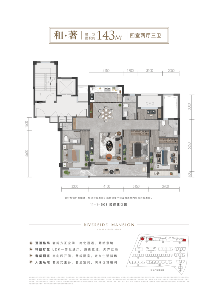 得力·和麓园的魅力,还来自于它高端改善的产品定位。其主力户型143㎡、196㎡为四房两厅三卫设计,实现了功能改善和尺度改善的兼顾,完美契合二孩、三代同堂家庭的需求,堪称高阶人物收藏城市公园且同时实现品质高改生活的不二选择。