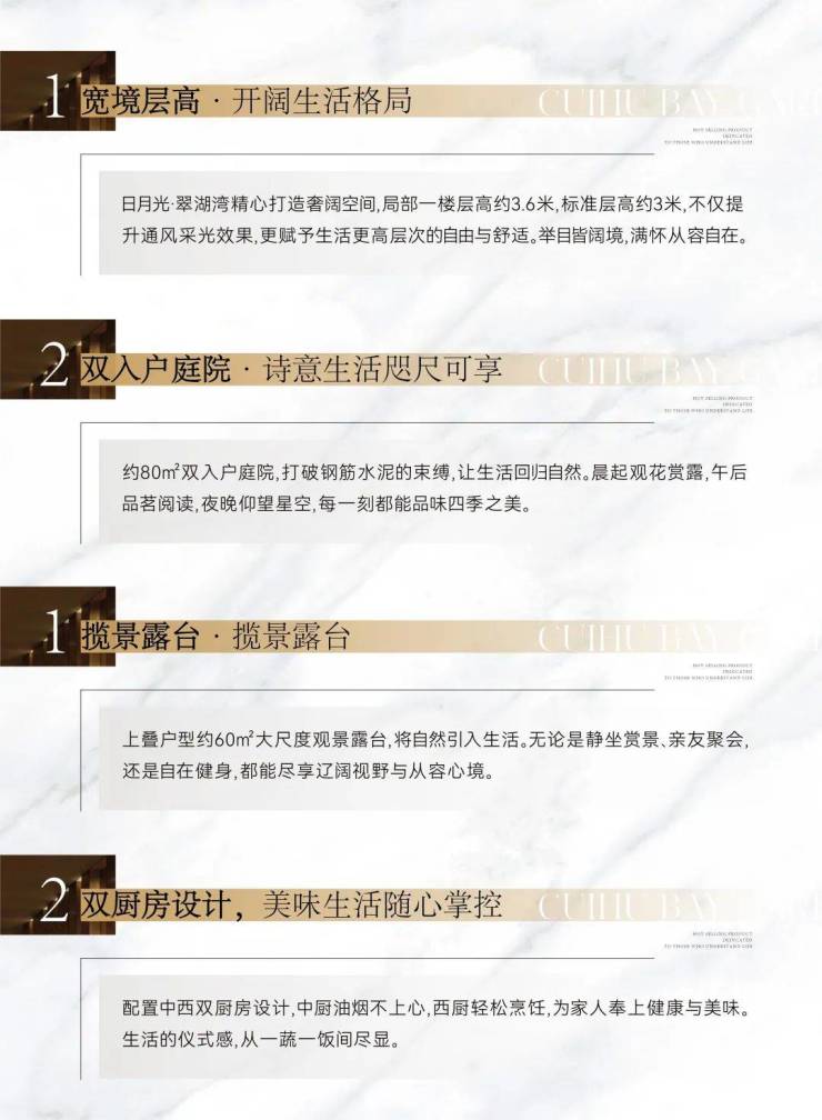 日月光深耕房地产开发领域多年,始终坚守高品质人居理念,致力于“少墅派,为少数”的生活方式,为改善型人群提供更高居住体验。翠湖湾项目从品质标准出发,围绕建筑工艺、舒适度、智能化、绿色环保等方面,全面提升居住体验: