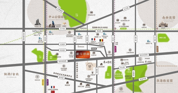 项目位于长宁区定西路板块新华银座.,地处静安,徐汇,长宁交界处,周边静安寺,南京西路,徐家汇,淮海西路商圈环绕,项目周围人文气息浓厚,有丁香花园(李鸿章故居),巴金旧居,武康大楼,宋庆龄故居等,往西就是定西路美食街,愚园路商圈仅在咫尺,为业主提供了生活的便利。