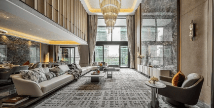 景观特色:打造了近 20,000㎡的 “超级中轴”,采用新加坡式流动艺术花园设计,全冠移植超 100 种乔木及特选花灌木,营造出层次丰富的园林景观。