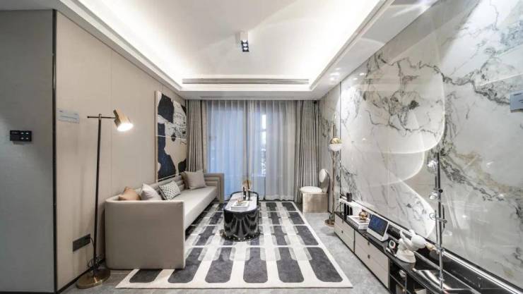 建面约118㎡户型设计,同样出自梁志天大师,用大面积岩板及皮革材质,将品质感融合在干净而规则的室内空间中,彰显出现代典雅的风格属性。