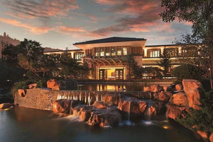 一棵价值近100万,约7米高的日本进口大红枫,成为下沉式会所的三个立面视线对景,让人眼前一亮。源于书卷灵感的巨型镜面水幕墙,传达“书香世家”的寓意。水幕墙立面的进口安哥拉黑石材,与三层跌水相映衬,恢弘之感呼之欲出。