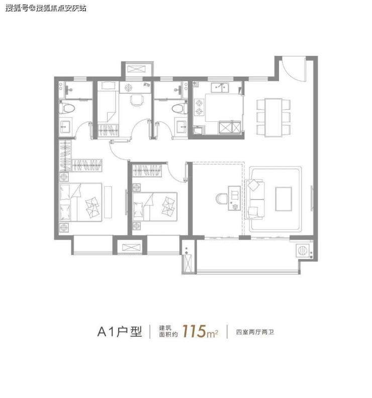 建面约115㎡的4房2厅2卫户型,超大面宽南向阳台、整体南北通透、主卧套房的设计,这个户型实现了多数人对于未来生活的期待。