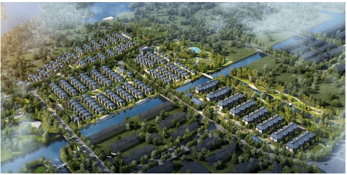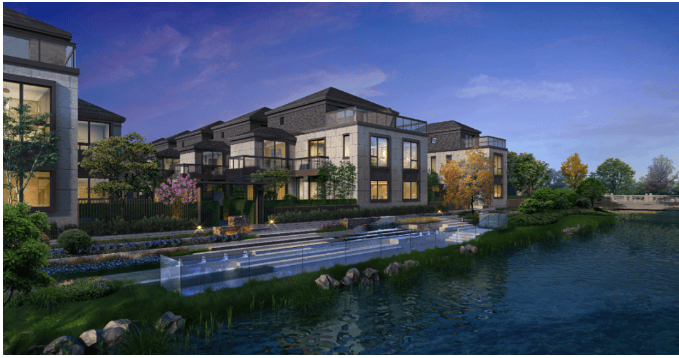 【上实·和风院】建筑外观是新中式格调,以黑色面瓦为黛顶,整体线条简洁明快。