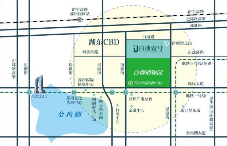以现代大道为轴线的园区湖东,集聚了金鸡湖景区、时代广场、诚品书店、中环广场(在建)、科文中心、ICC、国金中心、白塘公园、现代传媒广场、东沙湖公园、奥体中心、九龙医院、儿童医院等资源配套,以其无可争议的先进规划和得天独厚的自然环境,成为苏州乃至长三角宜居区域。