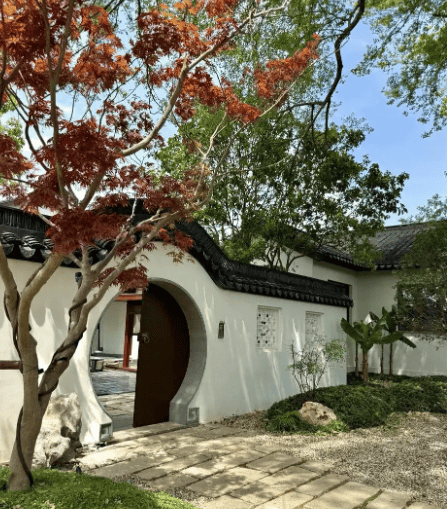 风格:江南水乡中式,粉墙黛瓦、青砖石板、月亮门、回廊庭院