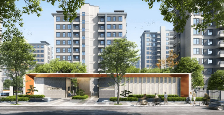社区景观:现代简约立面,围合式布局;内部规划三大景观组团、环形健身步道、儿童游乐区、成人健身区;南侧紧邻约 7 万㎡梅李体育公园,景观视野舒适。