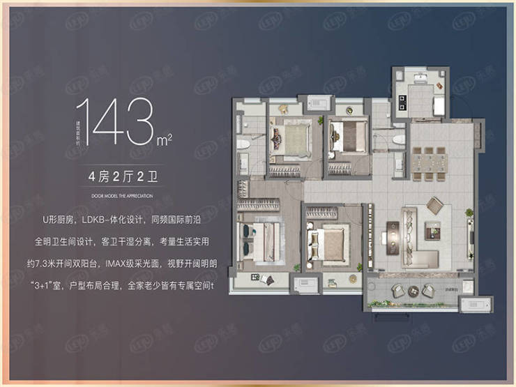 U型厨房,LDKB一体化设计,同频国际前沿 全明卫生间设计,客卫干湿分离,考量生活实用 约7.3米开间双阳台,IMAX级采光面,视野开阔明朗 “3+1”室,户型布局合理,全家老少皆有专属专座