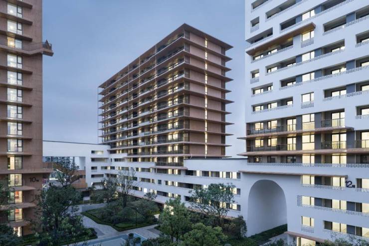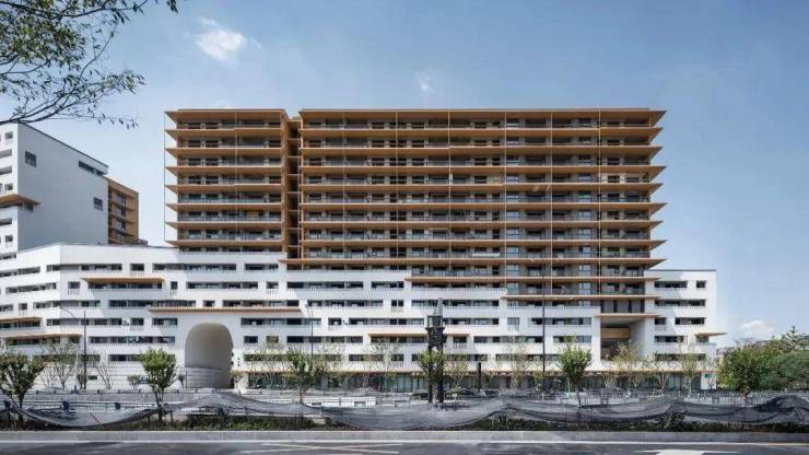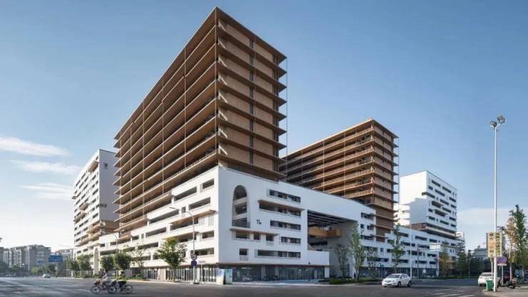 安置房与公租房包含50-130㎡面积范围内共九种户型,为了让住户获得更好的居住体验,我们在设计上多采用双开间、三开间阳台,以最大限度地获取阳光、城市景观及内院等资源,确保无论南北或东西,均有所得。为了让空间尺度更亲切、舒适,我们用白色与木纹涂料分界7层空间上下;东西向立面采用预制镂空砖,用低成本的物理节能方法实现遮阳隔热。衢州古城门和传统民居给予我们形式灵感:大尺度的古城拱形门洞增强了居民回家的仪式感,高层立面的水平挑檐唤起“老宅披檐”的衢州记忆,兼有防水、防雨等现实功能。