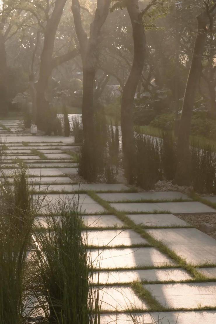 在本案的设计中,阳光能够充分渗透并覆盖后场的开放空间,使空间不仅具备静谧的内涵,更具备充沛的生命力。阳光在不同时间、不同季节的变化,赋予了空间动态的美学表现,从早晨的温暖晨曦到傍晚的柔和余晖,光影的流转不断丰富景观的层次感与深度感,带来一种时刻变化的、富有活力的空间体验。