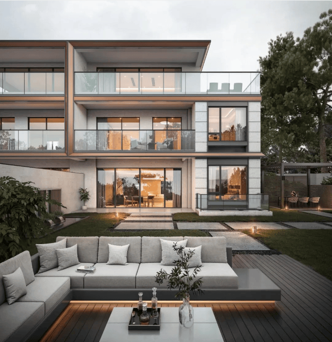 建筑立面遵循Less is more理念,采用大窗墙比、大面积通透玻璃的设计,追求边框隐形,呈现“与自然无界相融”的居住形态,融入香槟色铝板、黑色金属线条,还原东方建筑中的暖调与纹理,勾勒东方通透天地之大美与西式现实主义相融合的美感,让建筑与自然相映成趣,营造一种在繁华里安谧静雅的居住境界。
