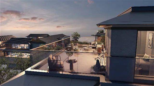 宋风美学设计:外立面采用铝板、石材及玻璃幕墙,叠墅融合宋式坡顶与挑檐,打造东方院墅美学,如近看可见六棱柱础、挂落、擗帘杆等匠心融入,将宋式建筑的纤巧秀丽悉数兑现。