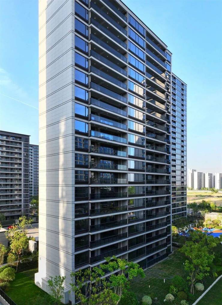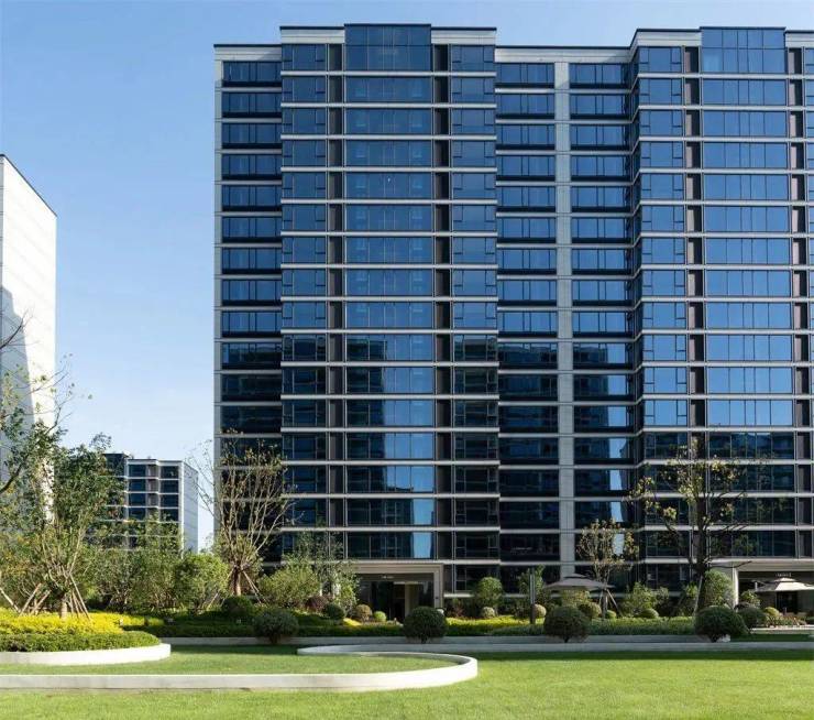 外立面设计:独步嘉兴的蓝钻晶幕立面,独具质感的石纹铝板缀以亮银色线条,搭配浅蓝灰玻璃幕墙,大气且奢华。门窗玻璃采用双层中空 LOW-E 玻璃,北立面采用一镜到底的台玻玻璃,就连窗框下方用的也是铝合金百叶,还额外追加投入增加了 7 万米的铝合金装饰线条。
