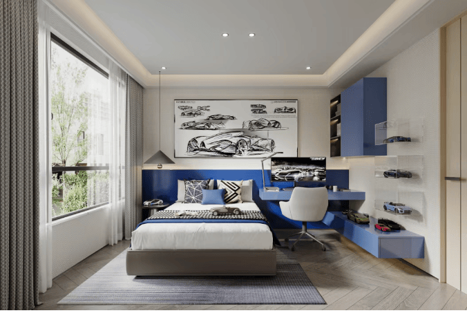 143㎡四房两厅两卫户型:入户玄关设计,四开间大面宽,整体的向阳面达到约 14.5 米,采光通透性极好。餐客厅一体化,连接面宽 7.5 米的超大阳台,可延展聚会、娱乐、亲子等多元场景。主卧采用套房设计,带有飘窗,兼顾私密性和舒适性。