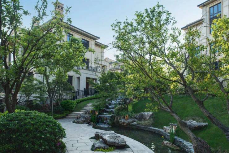依托自然山水和高差之势,绿谷云溪分别在欧陆山墅中部组团和东侧山体组团构建溪谷和台地公园,与入口处绿谷公园共同围合成林地起伏、溪水环绕的场地核心景观,中部区域打造小尺度的花园式景观,使得每个组团都拥有专属的公园体系。