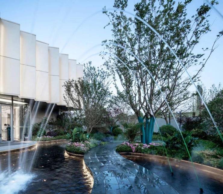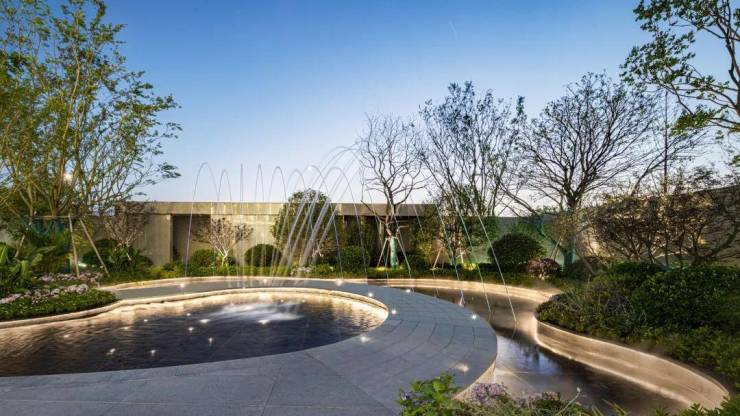步入这方静谧流动的庭院,能感受到夏溪潺潺,百折迂回的“探幽”乐趣,空间中抓取夏溪河、钱资湖的光影形态,幽潭意象,形成联动的意境空间,布局运用在景观打造中,以曲线美学艺术诠释场地文化精神,灵动水景经由石阶周折引入,曲径纵深,漫步此间,观境由心,归逸溪居,呈现一场“溪绕礼遇,一浸碧空,自然天成”的流动盛宴。