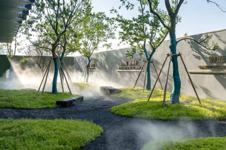 从售楼处室内向外望去,是一片树形婆娑的乌桕林,蜿蜒曲折的自然石径舒展开精神隧道的触角,光与影在烟雾缭绕间诉说冥想的悠然,诗意如画成荫,洒下一地斑驳。