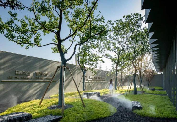 在有限的空间内,以与建筑同色的灰色围挡立面作为载体,任凭摇曳树影恣意投射之上,向阳乌桕,肆意怒放,光影静谧、庭院翠蔓,虚实互见,将空间清雅的气质进一步烘托。在看似冰冷、浮躁的都市里,树与场地,建筑,光影,相应成景,焕发出一沙一世界,一树一菩提的生命禅意。