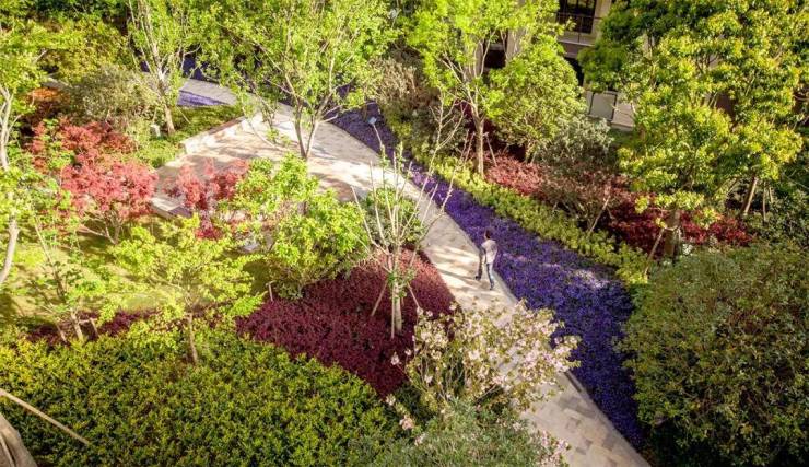 在宅间及建筑入口配置花期较长的开花乔木;中层搭配红枫、海棠、樱花;下层种植杜鹃花,山茶花、紫荆等各种开花灌木,以及色泽豔丽的时花,让居住者在出入之间时刻感受著这一份春风宜人。