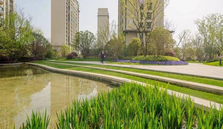 于是设计师以此背景蓝本,将 “水”元素在景观设计中再次昇华,从门口迎宾开始,直至回家的路上都有水景相随,草长莺飞之间,好似将京杭运河那秀丽壮观而四通八达的水脉浓缩为一副袖珍的画作。