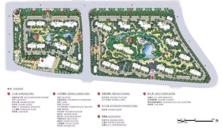 由超大泳池及各节点花园所组成的中央景观花园种植不同质感的植物,环绕自然水池、座椅和中央廊架,营造鬱鬱葱葱的软景空间。上层选用了整齐围绕泳池的银杏林;中层则多用当地的开花灌木;林下搭配种植杜鹃花、茶梅等各种开花灌木。