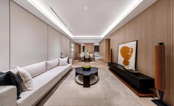 比如客厅的背景墙,在同行都纷纷上岩板时,天安1号却改变了一期的岩板,采用大面积木饰面,让整个空间更自然协调,视觉与触觉感觉都更加舒适。