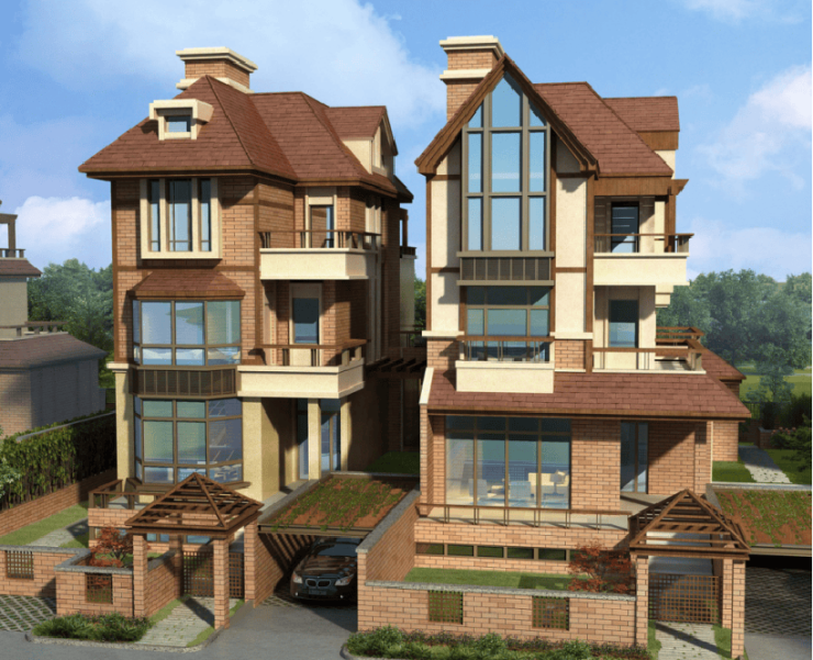来看一下实拍图,别墅长这样:前排法式风独栋、后排英伦双拼~