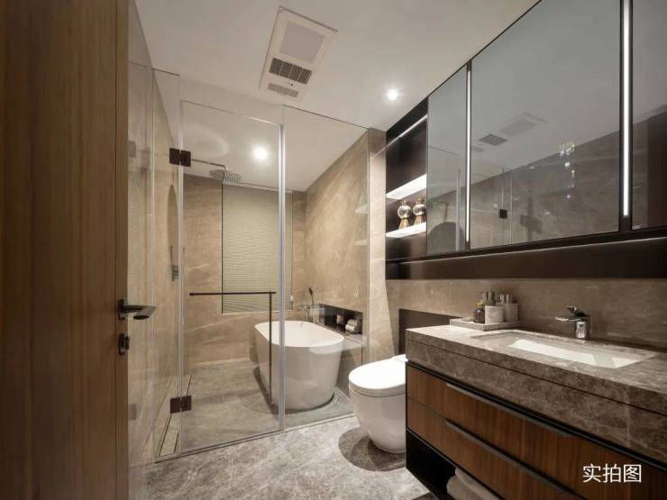 顶奢卫浴品牌瑞士劳芬的智能马桶、台盆、浴缸,皇室御用的德国当代龙头和花洒。洗完澡有松下暖风机“护航”,可以从容护肤;智能魔镜,打造精致妆面的同时还能轻松了解天气、新闻等实时资讯。