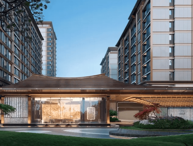建发新中式 + 会所配套:园林有叠石水景、风雨连廊,下沉会所满足高端休闲需求;