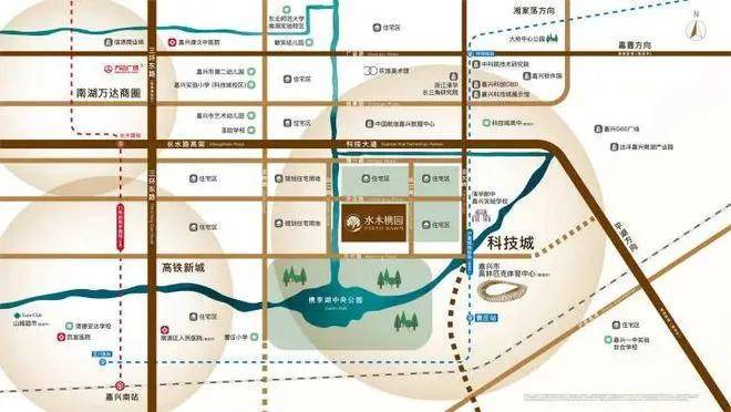 水木槜园,位于嘉兴科技城槜李湖中央公园北岸(清华附中西侧约400m)。周边有科技大道、三环东路等立体交通网,出行便捷。