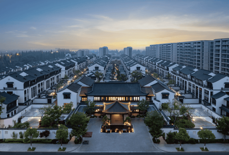 江南里:中式低密社区,合院 + 叠墅 + 洋房,园林水系、白墙黛瓦,绿城中式产品线代表作