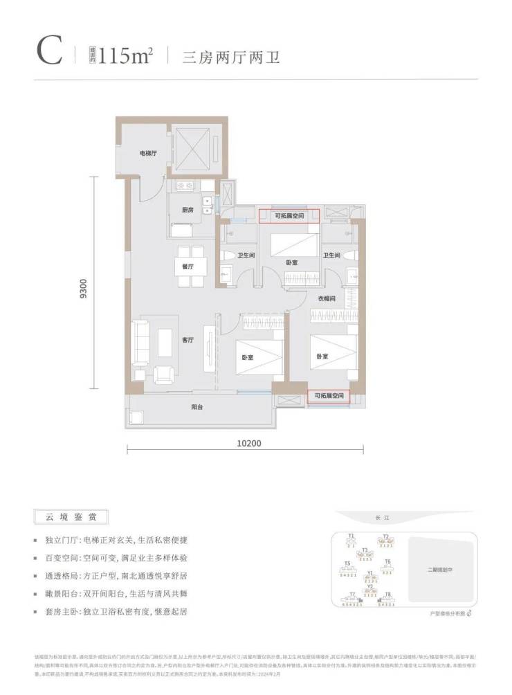 T8号楼主要包含建面约99平、115平两种户型,1个单元,2梯5户配置,这样小面积段的户型,此前在一线滨江属实难得一见。