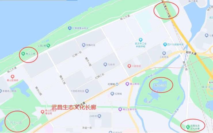 青山滨江范围内,是出了名的公园多。随便翻开地图一看,江滩公园、和平公园、青山公园等占地面积都非常大,和平公园、青山公园等老牌公园,森林覆盖、休闲体验可比汉口核心解放公园、中山公园等百年公园。