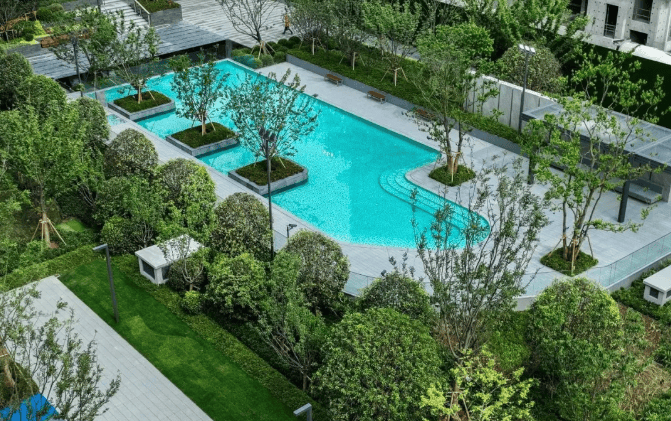 景观设计:采用新加坡造园手法,打造超万方中央景观轴,串联宅间花园,实现“四季有景、步移景异”。标志性景观包括约400平方米儿童戏水池、星空露台、500米康养漫步道等,兼顾美观与功能性。