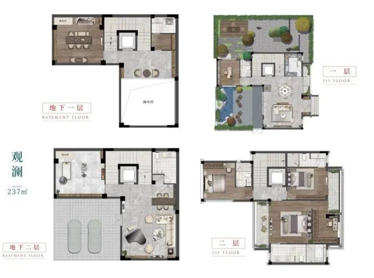 合院采用四合院的形式,围绕中央景观分为独门独户的几栋,确保每一栋的私密性。合院为两层,地下室不计入产证面积,且可以选择隔为两层。一层客厅餐厅,二层是卧室休息区,而地下室可以选择设置宴客厅、棋牌室等休闲娱乐场所,生活与娱乐互不干扰,地下室还带有车库。