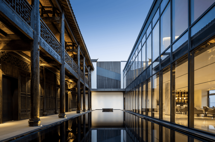 内庭院一边是古朴的老宅,一边是现代化的玻璃幕墙,从木材到玻璃的转变,是古典与现代对撞。玻璃全超白,保证玻璃幕墙最大程度的通透性。