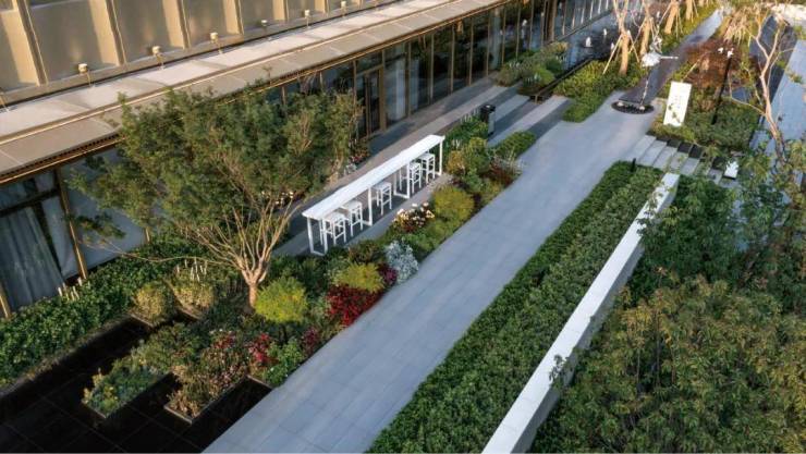 后场空间考量沿河风光带,以交错重叠的线性空间铺就行走之径,围合停驻空间。层层叠叠的条形绿篱、纵深悠长的镜面水景、自在舒适的户外吧台、纵向延伸的纯白景墙,为局限的场地提供多样化的景观语言,丰富观赏界面。