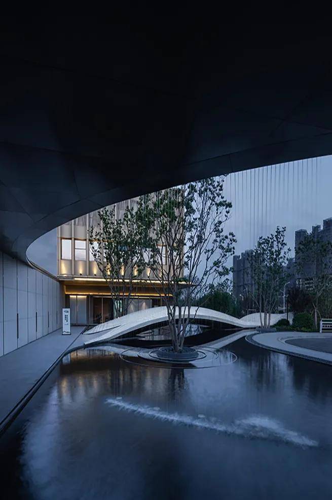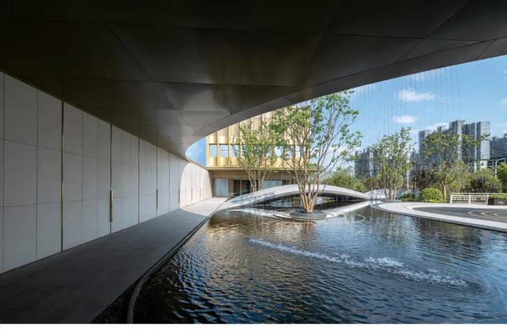 入口门廊一侧,一帘水幕垂空,顺势而下,肆意倾落,打破一池的寂静。水声叮叮咚咚,如大珠小珠落玉盘,奏响河畔烟火的四季变奏曲,轻轻唱出此地的欢愉与自在。