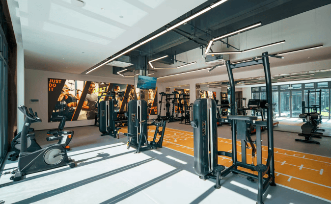 建筑与园林设计:采用极简“L”型超纤细铝板线条,融合大面玻璃(三玻两腔)、石材等高级质材打造寰幕立面,营造“天空之翼”建筑封面。约2.2万平方米的中央园林,以200米景观中轴串联下沉庭院、镜面水景与四季花园,配备680米环形跑道、下沉式恒温泳池、半场篮球馆等设施,构建“小奥体”式活力场域。