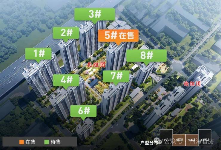 推售阶段:北组团3、5、8号楼已拿预售证,主推5号楼,3、8号楼待售。北组团其他楼栋及南区待开发。