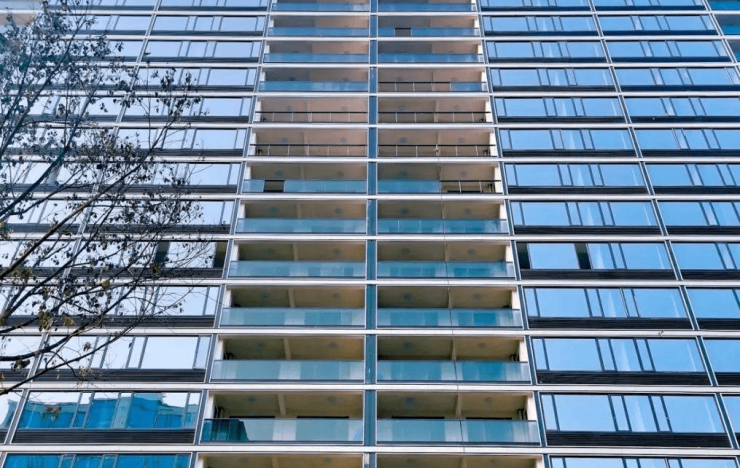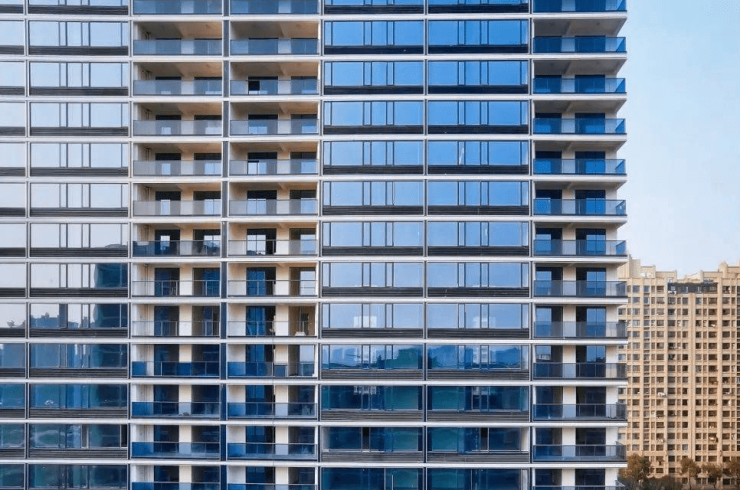 一幢幢挺拔的建筑,在阳光照耀下,泛着优雅蓝光。