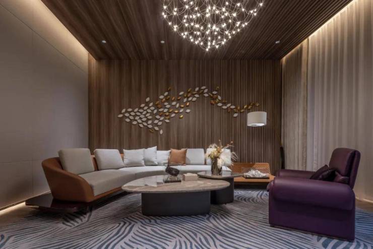 东方破晓(洽谈区),以大地色点缀浅棕营造雅致的体验氛围。墙面陶瓷装置的灵感来源于枝繁叶茂的树冠,它是永恒变幻的生命载体,通过现代写意的手法,运用瓷片创新重组,以形传神。