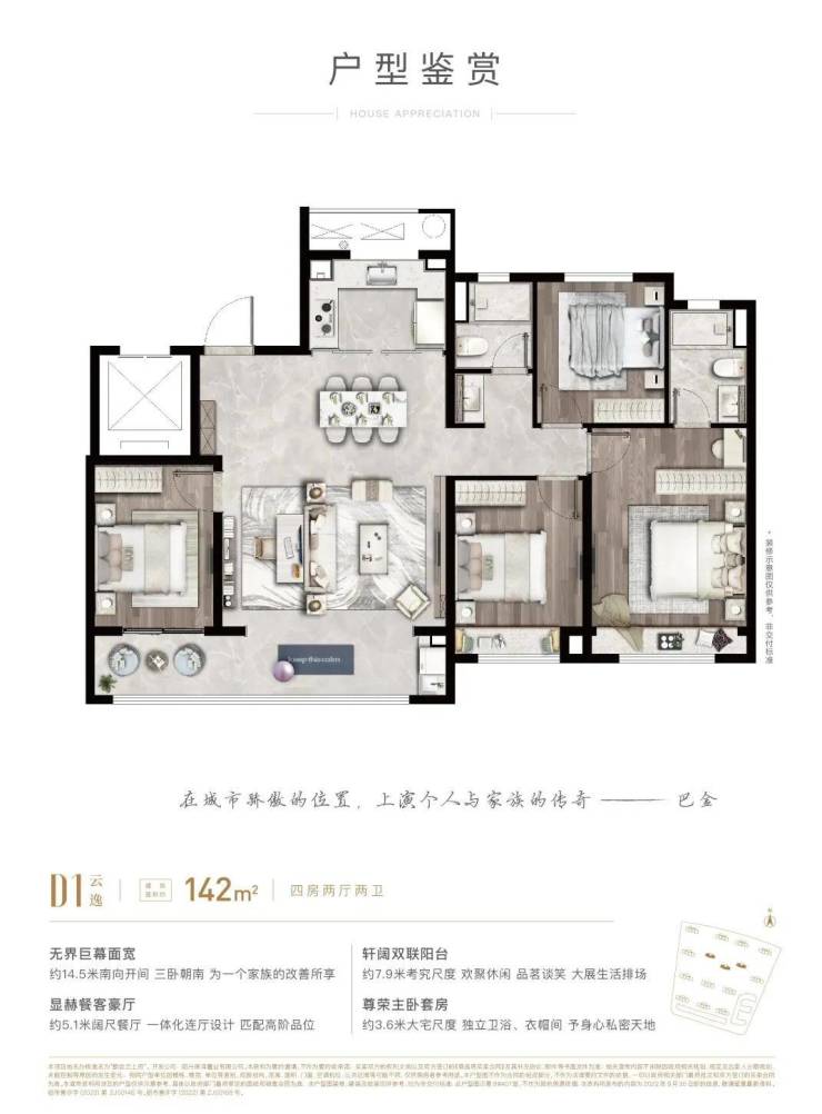 该户型约14.5米巨幕面宽+南向开间三卧朝南的布局符合当下改善所需。