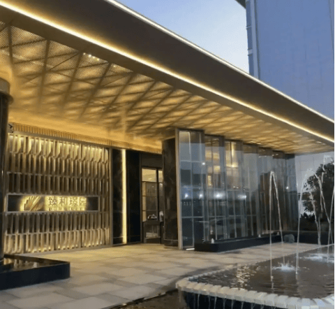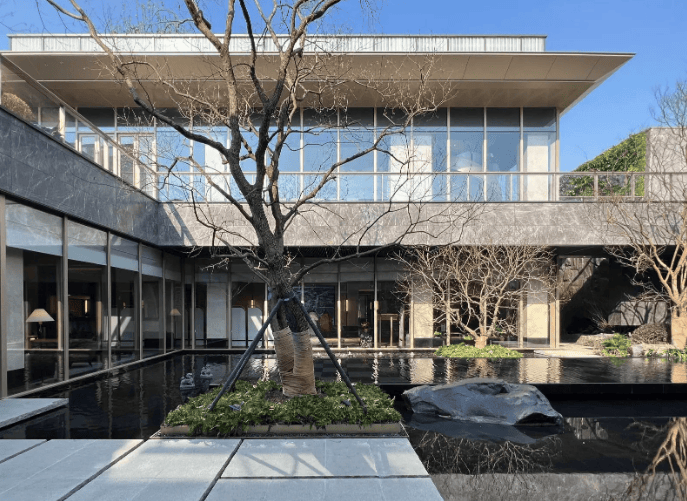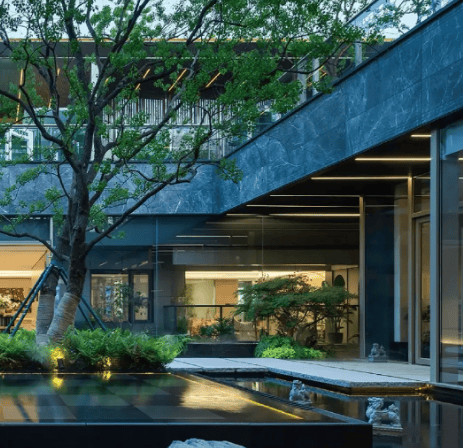 外立面:现代简约风格,局部铝板 + 大面积玻璃,公建化立面。