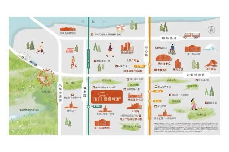 项目周边配套设施齐全,教育资源丰富。有湘湖师范学校附属小学、湘湖实验小学、高桥小学(南江分校)、萧山区第一实验小学、朝晖初中、高桥初中等。