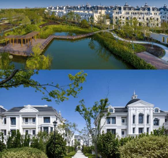 建筑风格:分法式、美式、英伦风组团;地上 3 层 + 地下 1 层(部分含阁楼),石材 + 真石漆立面,社区内水系蜿蜒,配 8000㎡阳光草坪、2250 米环形跑道、趣味果园 / 农场。