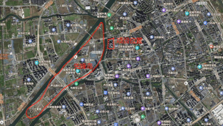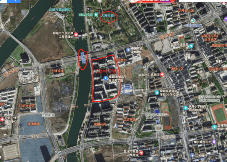 项目北侧是人民公园,西侧是串场河,环境比较好。拿地的时候,普遍认为是盐城一块压箱底的核心地块。实际开盘后,当地人并不认可这个位置,周边老旧小区多,学区并不好。