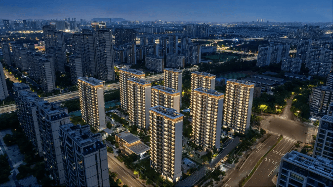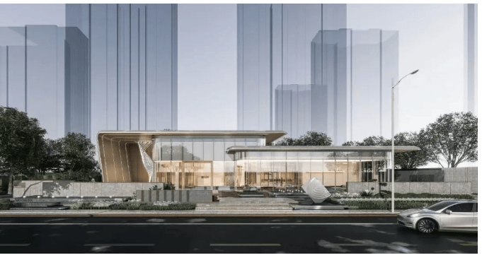 建筑与立面:采用现代都市美学设计,外立面以米白色和香槟色为主色调,搭配氟碳漆一体板、铝板线条和大面积玻璃,塔冠格栅与转角圆弧等细节处理精致,整体质感高级。