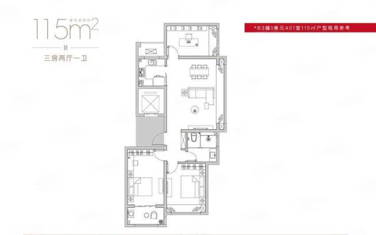3室2厅1卫1厨, 建面115.00平米